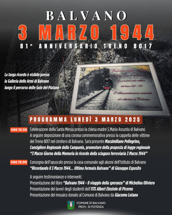 Ecco quindi che il 3 Marzo 2025 Balvano commemora l’81° anniversario della sciagura ferroviaria avvenuta proprio il 3 marzo 1944 nella Galleria delle Armi.