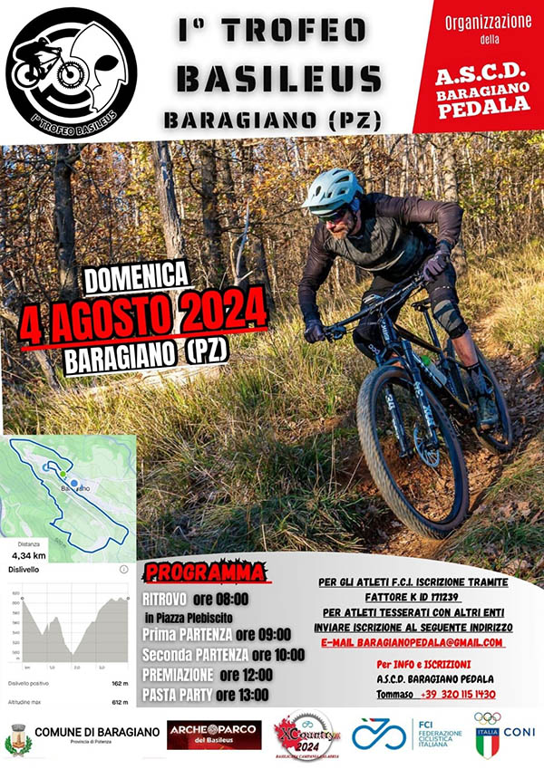 È ormai giunta in fase avanzata di preparazione il Trofeo Basileus di mountain bike cross country che l’Asd Baragiano Pedala che si intende allestire per Domenica 4 Agosto a Baragiano.