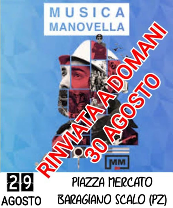 In particolare l’amministrazione comunale di Baragiano informa la cittadinanza che il concerto dei musica MANOVELLA previsto per questa sera è stato rinviato a domani.