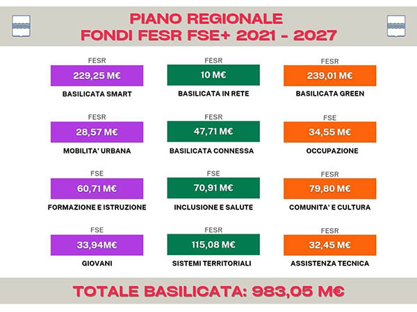 Grazie al nuovo PR plurifondo approvato, la Regione potrà avviare un imponente stagione di investimenti pubblici strutturata in un percorso basato su 11 Priorità che contribuiranno a rendere la Basilicata più competitiva, più verde, più connessa, più inclusiva e più vicina ai cittadini, secondo le linee strategiche dettate a livello europeo.