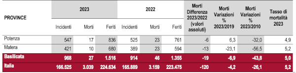 In Basilicata, nel 2023, si sono verificati 968 incidenti stradali, che hanno causato la morte di 27 persone e il ferimento di altre 1.516.