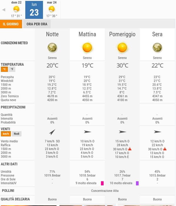 Secondo gli esperti di 3bmeteo, domani, Lunedì 23 Agosto, avremo bel tempo con sole splendente per l’intera giornata, non sono previste piogge.