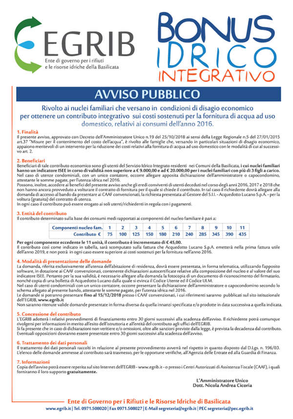 Lo fa sapere l’EGRIB (Ente di governo per i rifiuti e e risorse idriche della Basilicata).