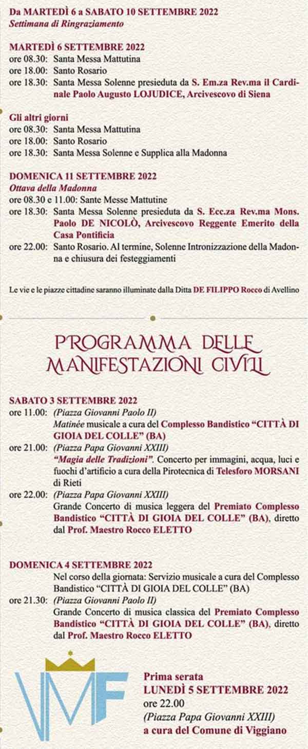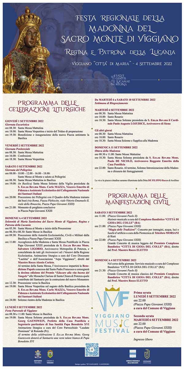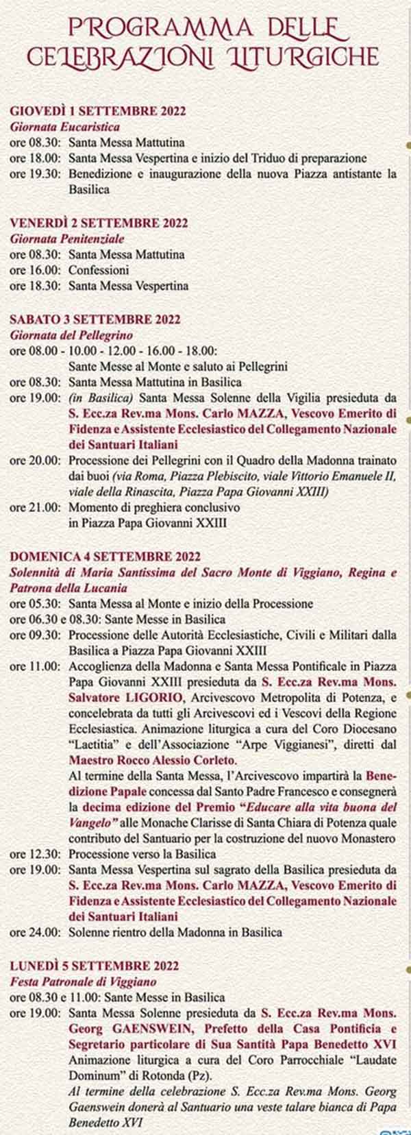 Quindi, Domenica 4 Settembre, la venerata immagine della Madonna, dopo la Santa Messa al Monte e l’inizio della processione alle ore 5:00 del mattino e le sante messe in Basilicata alle ore 6:30/8:30, verrà accolta in Piazza San Giovanni XXIII dove alle ore 11.00 verrà celebrata la Santa Messa Pontificale presieduta da S. Ecc. Mons. Salvatore Ligorio.