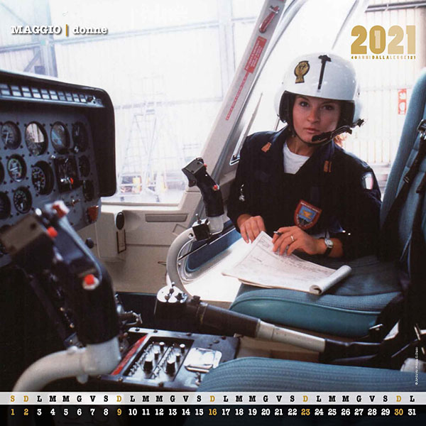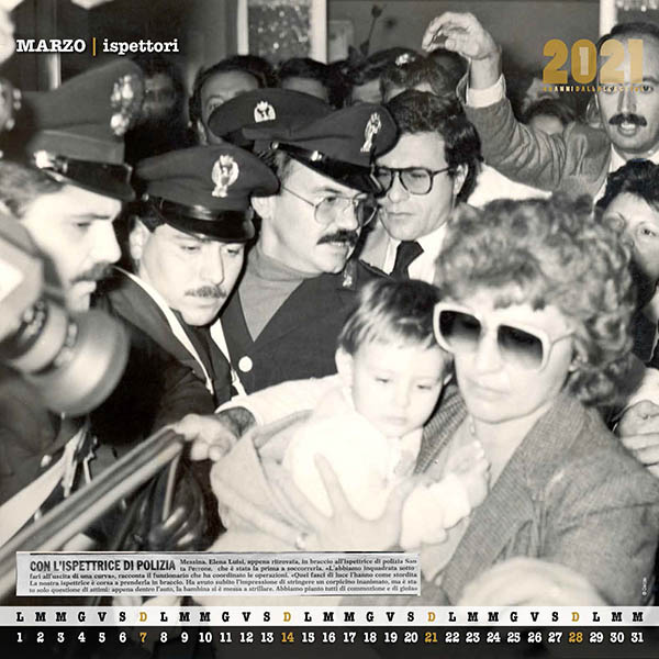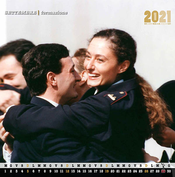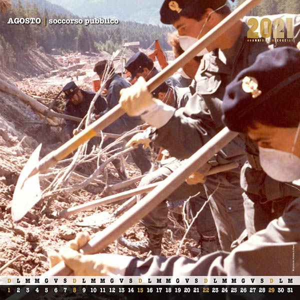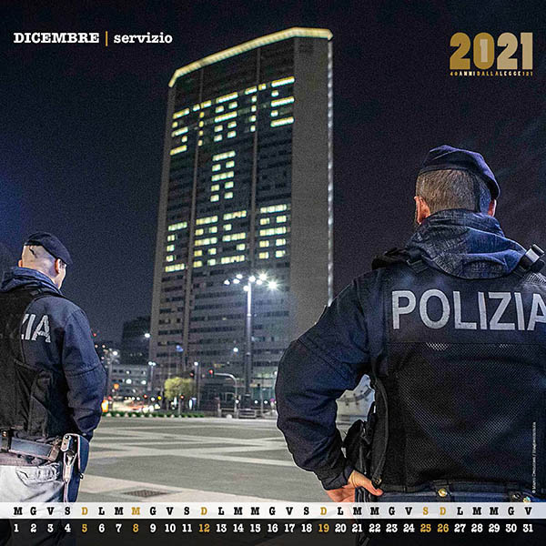 Tre immagini in particolare simboleggiano lo spirito di servizio: il mese di Marzo con l’ispettore Santa Perrone e la piccola Elena Luisi salvata dai suoi rapitori, il mese di Agosto con il reparto mobile che presta soccorso agli abitanti della Val di Fiemme, il mese di Dicembre con i poliziotti impegnati nell’attività connessa all’emergenza Covid 19, a salvaguardia della salute pubblica.