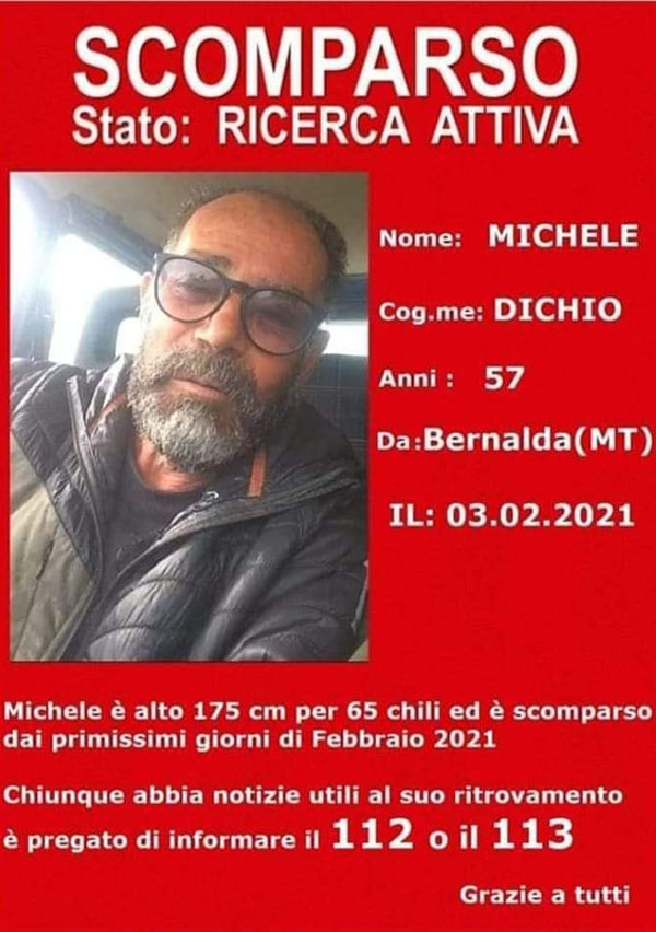 È scomparso Michele Dichio il 3 Febbraio 2021, un uomo di 57 anni di Bernalda (MT).