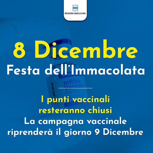 Fa sapere la Regione Basilicata che Mercoledì 8 Dicembre, in occasione della Festa dell’Immacolata, i punti vaccinali resteranno chiusi.