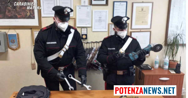 Nell’immediatezza, poco distante dal luogo del malfatto, veniva individuata e bloccata un’autovettura analoga a quella ripresa dal sistema di videosorveglianza nei pressi del negozio durante il tentativo di furto perpetrato poco prima, con a bordo due persone di Matera, già note ai militari operanti, le quali, sottoposte a perquisizione personale, estesa anche al veicolo in uso, venivano trovati in possesso di vari attrezzi e di una smerigliatrice a batteria, compatibili con i segni d’effrazione rilevati sui sistemi di blindatura della struttura del distributore automatico manomesso.