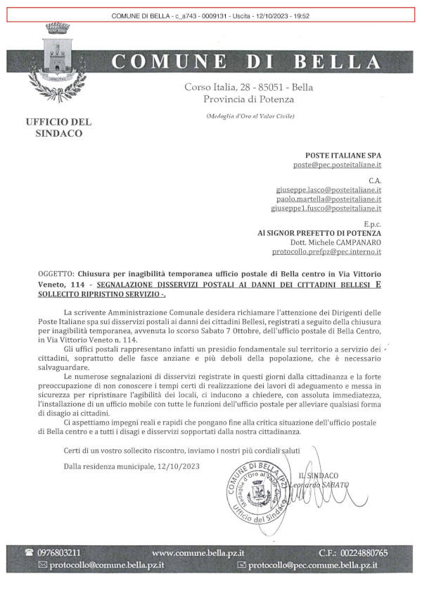 “OGGETTO: Chiusura per inagibilità temporanea ufficio postale di Bella centro in Via Vittorio Veneto, 114. SEGNALAZIONE DISSERVIZI POSTALI AI DANNI DEL CITTADINI BELLESI E SOLLECITO RIPRISTINO SERVIZIO.
