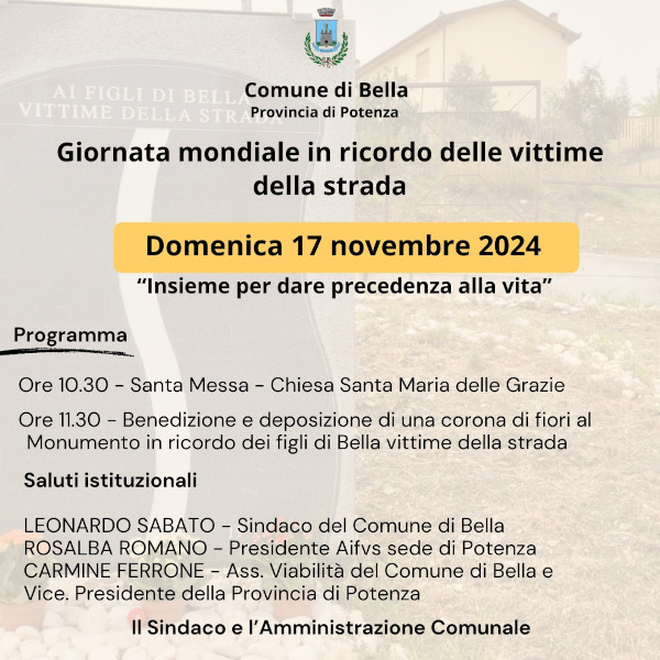 Domenica 17 novembre 2024, il Comune di Bella celebrerà la Giornata Mondiale in ricordo delle vittime della strada, con un evento dal titolo “Insieme per dare precedenza alla vita“.
