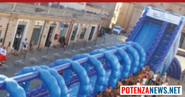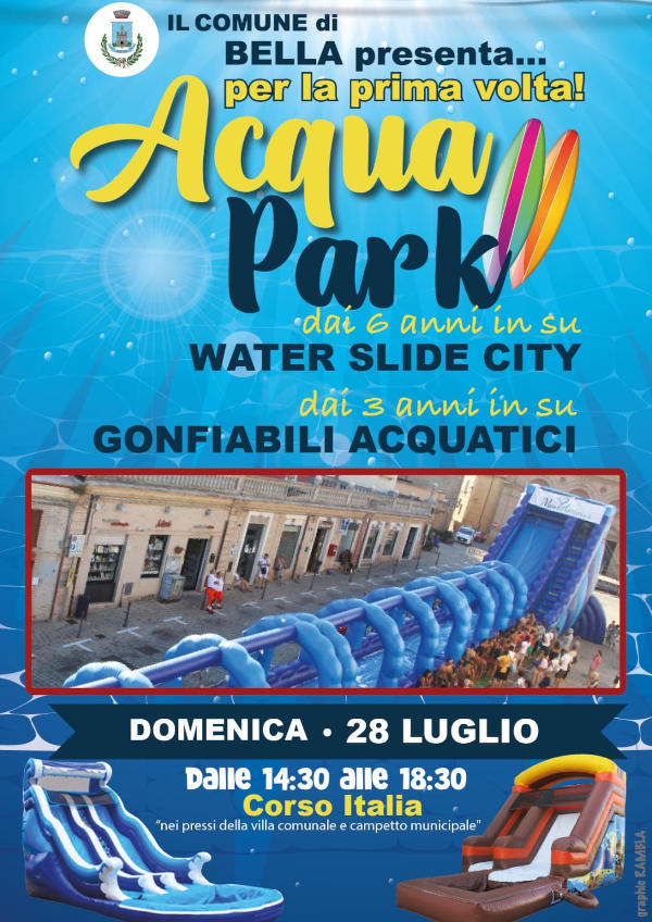 “Per creare anche a Bella l’atmosfera di vacanza, per chi una vacanza non ce l’ha, per portare un po’ di refrigerio e divertimento a chiunque ne avesse bisogno e desiderio, bambini e bambine, ragazze e ragazzi, giovani e meno giovani, BELLESI di TUTTE LE ETÀ, arrivano in Corso Italia gli scivolo e i gonfiabili ad acqua“.