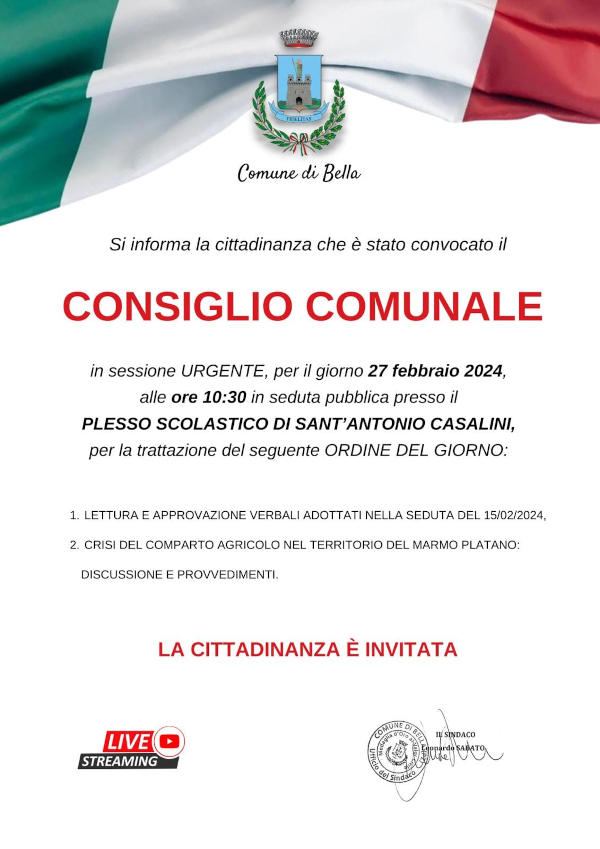 “Convocazione seduta pubblica in sessione urgente del Consiglio Comunale per il giorno Martedì 27 Febbraio c.m. alle ore 10:30 presso l’edificio scolastico di Sant’Antonio Casalini.