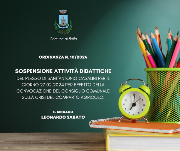 “Sospensione attività didattiche del Plesso di Sant’Antonio Casalini per il giorno 27.02.2024 per effetto della convocazione del consiglio comunale sulla crisi del comparto agricolo“.