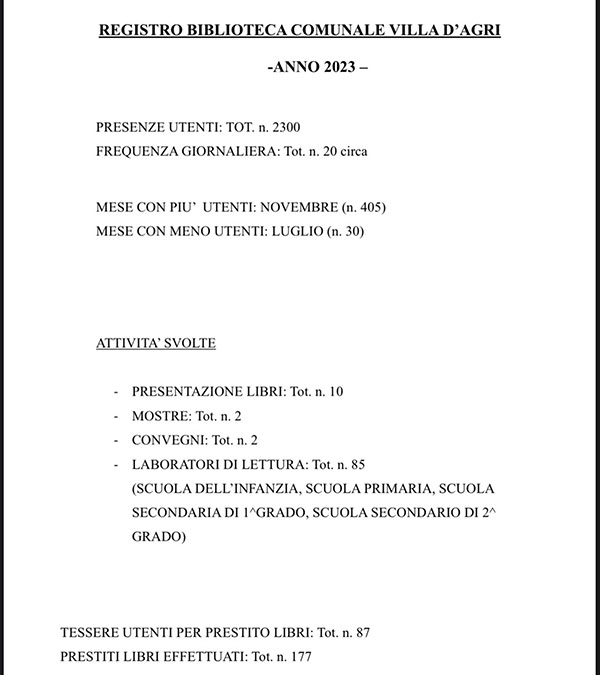 Biblioteca Comunale Villa d’Agri: un piccolo e moderno scrigno che ha registrato nel 2023 il record di presenze! Ecco il bilancio