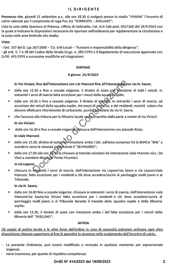 “Premesso che, Giovedi 21 settembre p.v., alle ore 18.30 si svolgerà presso lo stadio “VIVIANI” l’incontro di calcio valevole per il campionato di Lega Pro, tra “SORRENTO – AVELLINO”;