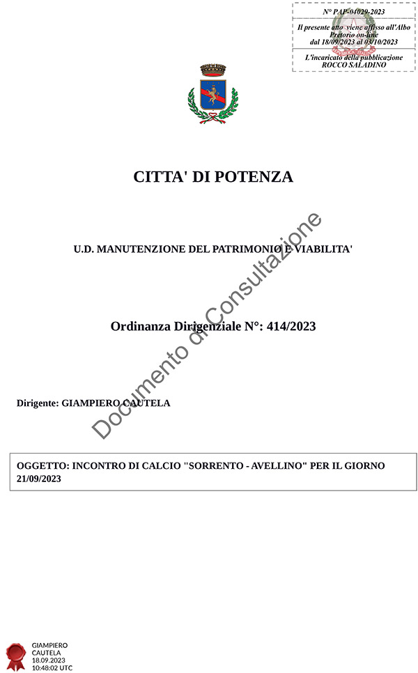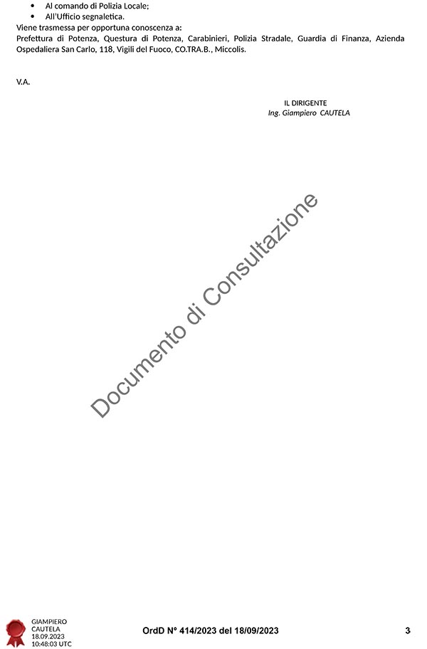 vista la nota della Questura di Potenza, Ufficio di Gabinetto, Cat. A/4 Gab prot. 0017260 del 18/9/2023 con la quale si indicano le disposizioni necessarie da riportare nell’ordinanza per regolamentare la circolazione e la sosta nelle aree limitrofe allo stadio;