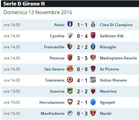 Di seguito i risultati e la classifica della Serie D – Girone H.