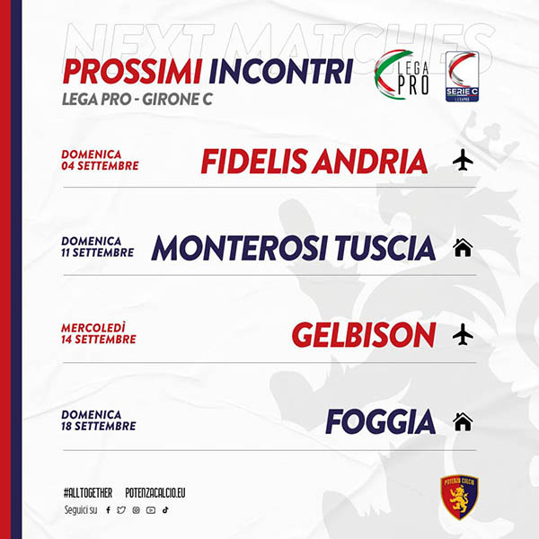 Nel girone C il Potenza esordirà il 4 settembre sul campo della Fidelis Andria e affronterà il Monterosi Tuscia l’11 settembre in casa.