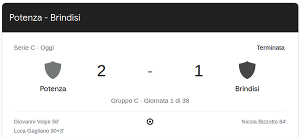 Si è chiusa poco fa la partita tra Potenza Calcio e Brindisi, gara valida per la giornata 1 del campionato Serie C – Girone C .
