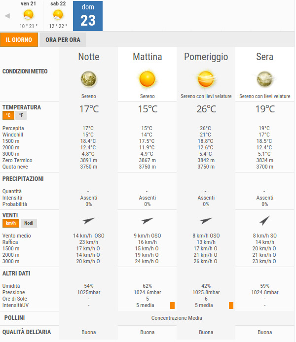 Secondo gli esperti di 3bmeteo, domani, Domenica 23 Ottobre, avremo cieli in prevalenza sereni o poco nuvolosi per l’intera giornata, non sono previste piogge