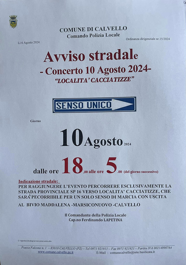 “Per raggiungere l’evento percorrere esclusivamente la SP 16 verso località Cacciatizze, che sarà transitabile per un solo senso di marcia con uscita al bivio Maddalena-Marsiconuovo-Calvello”.