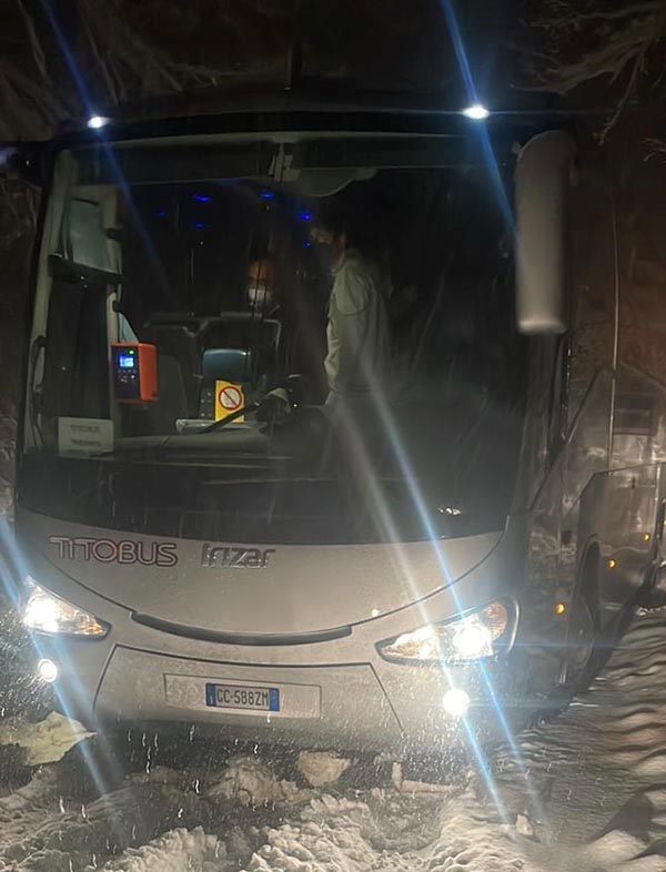 Nella foto seguente il pullman dei lavoratori Stellantis che è arrivato a Tricarico (MT) con circa 2 ore e mezza di ritardo.