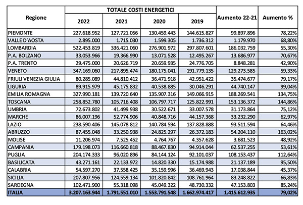 A livello nazionale, la spesa sanitaria relativa ai costi energetici di tutte le Regioni e Province Autonome per l’anno 2022 è aumentata complessivamente di 1.415.612.935 euro, corrispondente ad un aumento medio pro-capite di 23,98 euro che corrisponde ad un aumento percentuale del 79,02 %; rispetto all’anno 2019 (livello pre-pandemico), l’incremento del 2022 è pari al 92,9%.