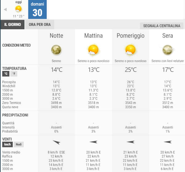 Secondo gli esperti di 3bmeteo, domani, Martedì 30 Aprile, avremo cieli in prevalenza poco nuvolosi per l’intera giornata, non sono previste piogge.