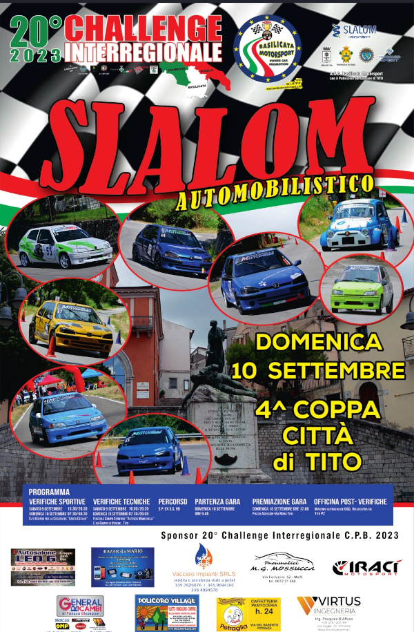 Tutto pronto per la Gara Slalom in Salita organizzata dopo 25 anni (per la 4 volta) nella Città Di Tito grazie ad un Team di Ragazzi Martinelli Motors, al Comune Di Tito a tutti gli sponsor che hanno contribuito: il tutto si è svolto sotto l’Organizzazione della Basilicata Motorsport che si occupata di tutta la gestione dell’evento.