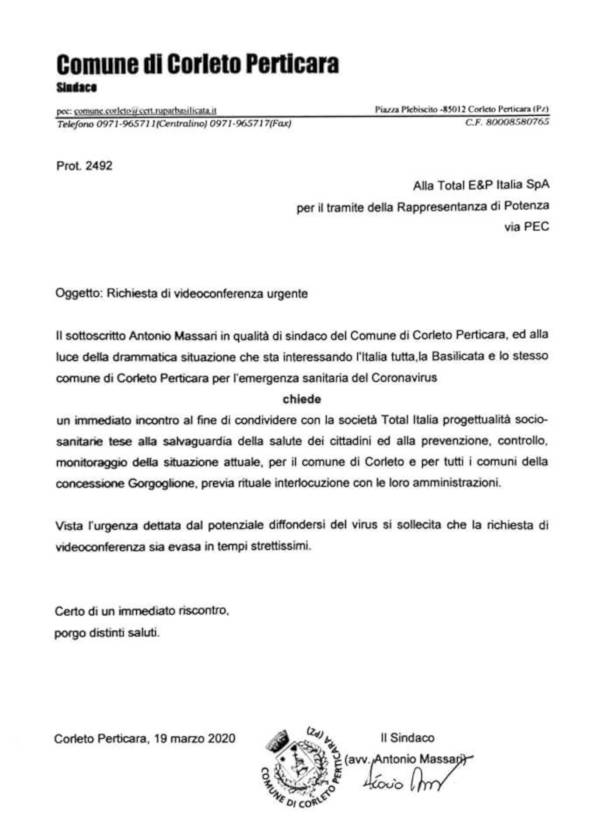 Dopo le richieste fatte dai comuni affinché la Total riduca produzione e personale nell’impianto petrolifero lucano, anche il Comune di Corleto Perticara, visto lo stato di emergenza sanitaria, chiede un incontro con la società al fine “di condividere progettualità socio-sanitarie tese alla salvaguardia della salute dei cittadini ed alla prevenzione, controllo, monitoraggio della situazione attuale”.