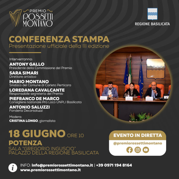 Conferenza stampa di presentazione ufficiale della terza edizione del “Premio Rossetti Montano” che si terrà a Corleto Perticara dal 19 al 23 giugno.