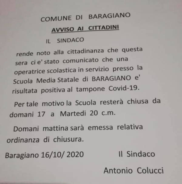“Ci è stato comunicato che una operatrice scolastica, in servizio presso la Scuola Media Statale di BARAGIANO, è risultata positiva al tampone Covid-19.
