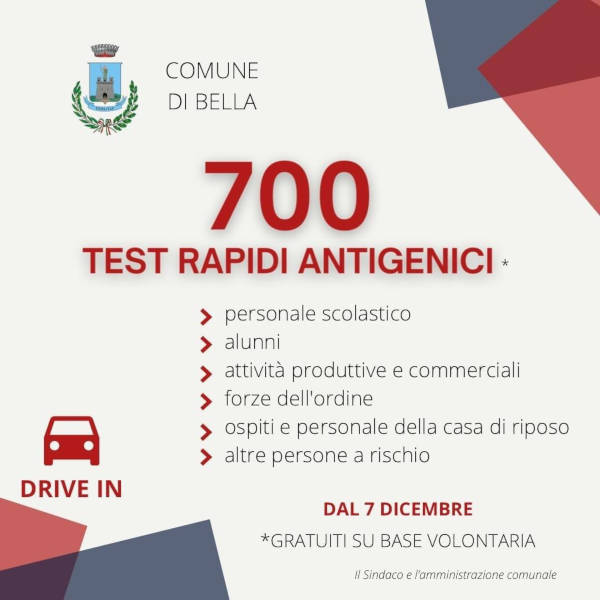 “Nell’ambito delle iniziative volte alla prevenzione ed al contenimento del contagio da Covid-19 nel Comune di Bella, l’Amministrazione, come deliberato con Delibera di Giunta n.112 del 3 Dicembre 2020, intende continuare a promuovere lo screening mediante l’esecuzione di 700 TAMPONI antigenici rapidi naso-faringei o nasali, che si aggiungono ai precedenti 160, da somministrare alla popolazione secondo le priorità così come definite dal Dipartimento Politiche alla Persona della Regione Basilicata.