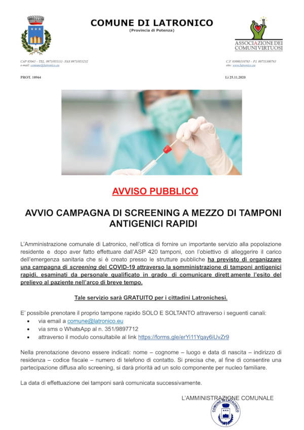 Coronavirus: a Latronico campagna di screening sulla popolazione! Ecco come prenotarsi