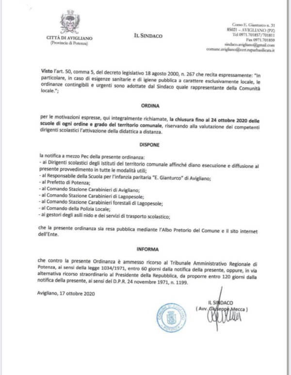 per le motivazioni espresse, qui integralmente richiamate, la chiusura fino si 24 Ottobre 2020 delle scuole di ogni ordine e grado del territorio comunale, riservando alla valutazione dei competenti dirigenti scolastici l’attivazione della didattica a distanza”.