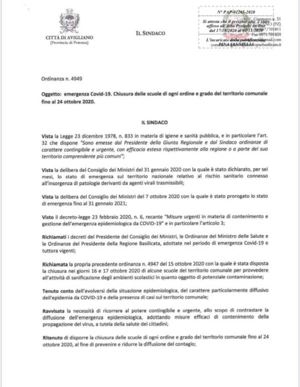 Il Comune di Avigliano (PZ) proroga la chiusura delle scuole.