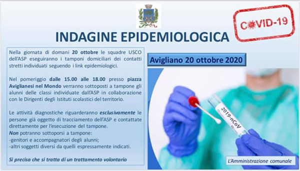 Domani 20 Ottobre, ad Avigliano (PZ), è stata confermata l’indagine epidemiologica in cui verranno sottoposti a tampone gli alunni delle classi individuate dall’Asp in collaborazione con le dirigenti degli istituti scolastici del territorio.