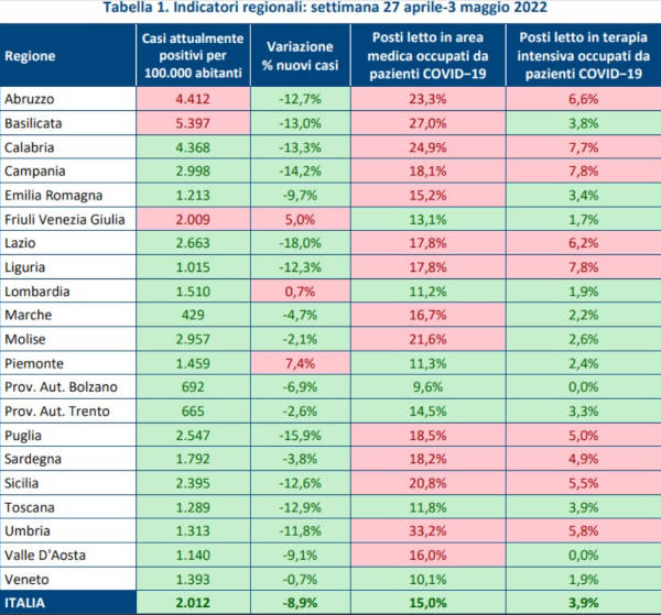 “Dal 27 aprile al 3 maggio scorso, in Basilicata si registra una performance in peggioramento per i casi attualmente positivi per centomila abitanti (5.397 rispetto ai 5.247 della settimana precedente) ma si evidenzia una diminuzione dei nuovi casi (-13%), sempre rispetto al periodo 20-26 aprile scorso.