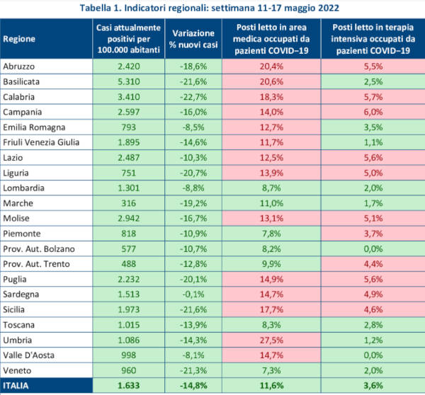 “In Basilicata, nella settimana dall’11 al 17 maggio, si registra una performance in miglioramento per i casi attualmente positivi per 100 mila abitanti (5.310) e si evidenzia una diminuzione dei nuovi casi (-21,6 per cento) rispetto alla settimana precedente.