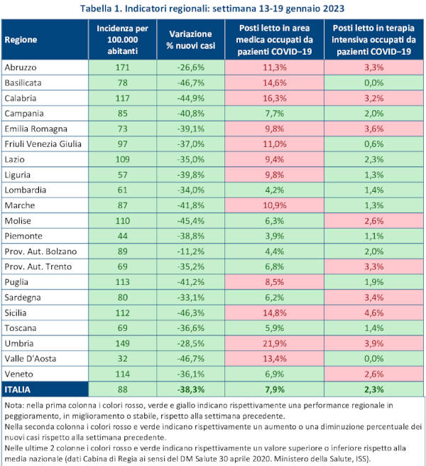 “Nella settimana dal 13 al 19 gennaio, in Basilicata si registra un miglioramento dell’incidenza per 100 mila abitanti (78) e si evidenzia una diminuzione dei nuovi casi (-46,7%) rispetto alla settimana precedente.