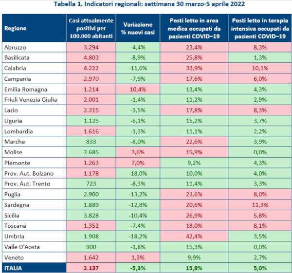 “Dal 30 marzo al 5 aprile scorso, in Basilicata si registra una performance in peggioramento per i casi attualmente positivi per centomila abitanti (4.803 rispetto ai 4.442 della settimana precedente), ma si evidenzia una diminuzione dei nuovi casi (-8,9%).