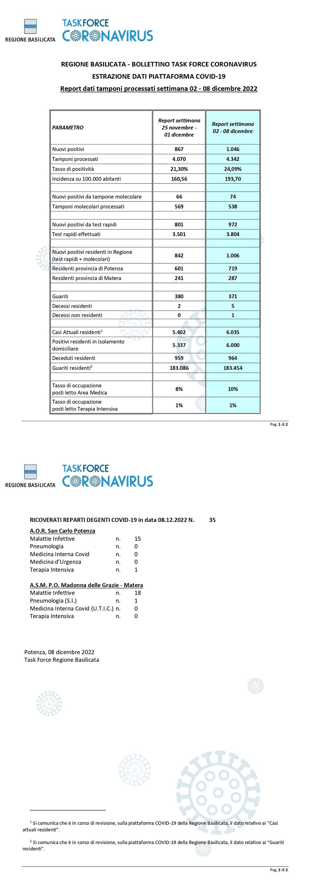 La task force regionale comunica che nella settimana dal 2 all’8 Dicembre, sono stati processati 4.342 tamponi (molecolari ed antigenici) per la ricerca di contagio da Covid-19, di cui 1.046 sono risultati positivi.