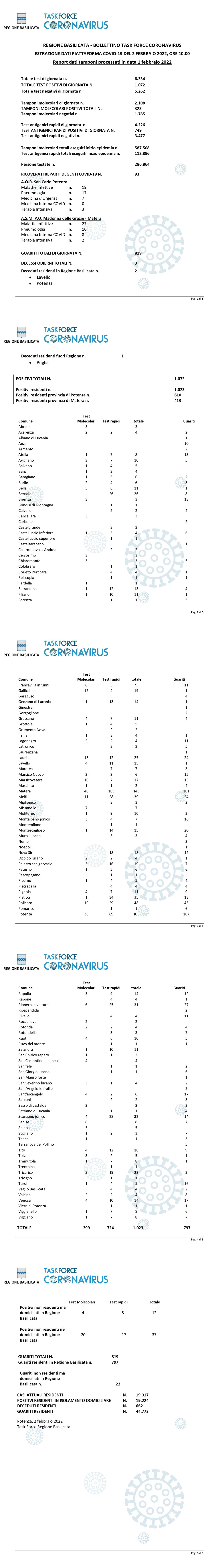 La task force regionale comunica che nella giornata di ieri, 1 febbraio, sono stati processati 6.334 tamponi (molecolari ed antigenici) per la ricerca di contagio da Covid-19, di cui 1.072 sono risultati positivi (1.023 riguardano residenti in Basilicata).