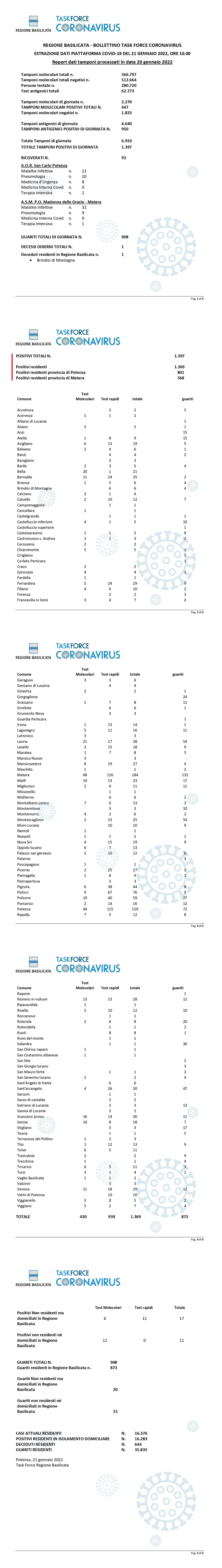 La task force regionale comunica che nella giornata di ieri, 20 Gennaio, sono stati processati 6.910 tamponi (molecolari ed antigenici) per la ricerca di contagio da Covid-19, di cui 1.397 sono risultati positivi.
