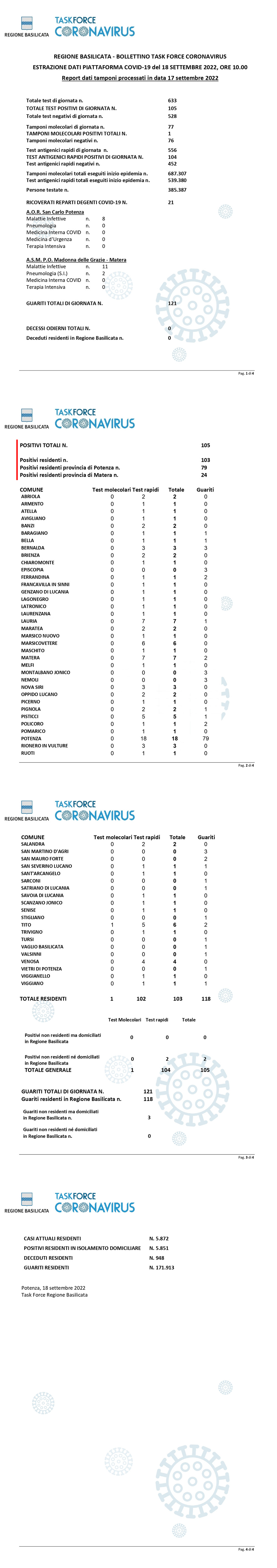 La task force regionale comunica che nella giornata di ieri 17 Settembre, sono stati processati 633 tamponi (molecolari ed antigenici) per la ricerca di contagio da Covid-19, di cui 105 sono risultati positivi.