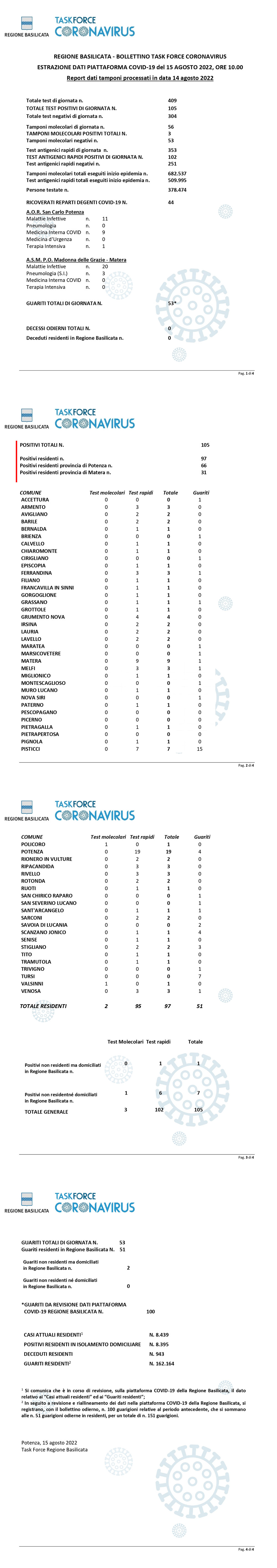 La task force regionale comunica che nella giornata di ieri 14 Agosto, sono stati processati 409 tamponi (molecolari ed antigenici) per la ricerca di contagio da Covid-19, di cui 105 sono risultati positivi.