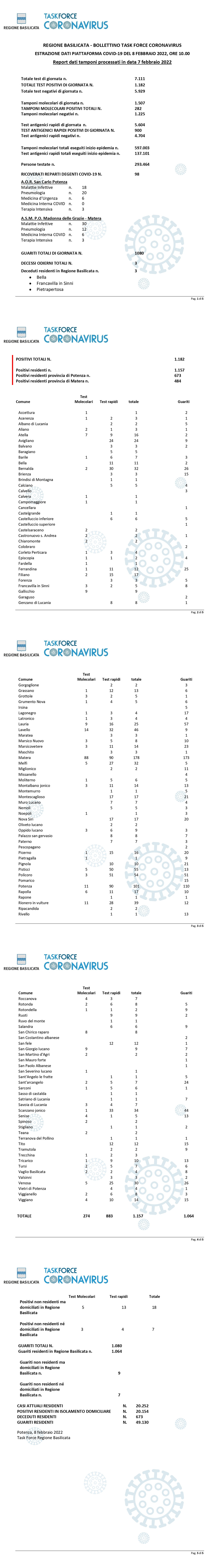La task force regionale comunica che nella giornata di ieri, 7 Febbraio, sono stati processati 7.111 tamponi (molecolari ed antigenici) per la ricerca di contagio da Covid-19, di cui 1.182 sono risultati positivi.