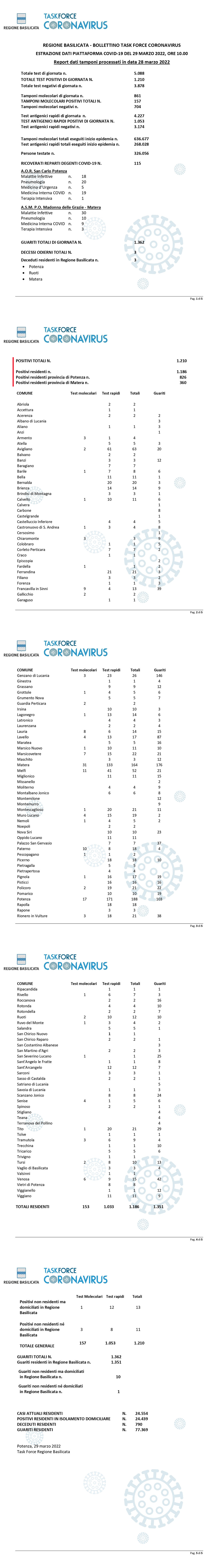 Sempre nella giornata di ieri, sono stati processati 5.088 tamponi (molecolari ed antigenici) per la ricerca di contagio da Covid-19, di cui 1.210 sono risultati positivi.