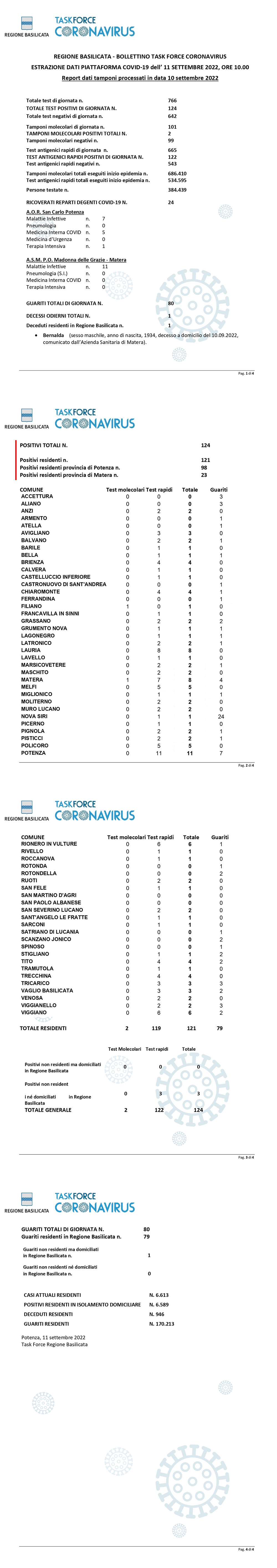 La task force regionale comunica che nella giornata di ieri 10 Settembre, sono stati processati 766 tamponi (molecolari ed antigenici) per la ricerca di contagio da Covid-19, di cui 124 sono risultati positivi.