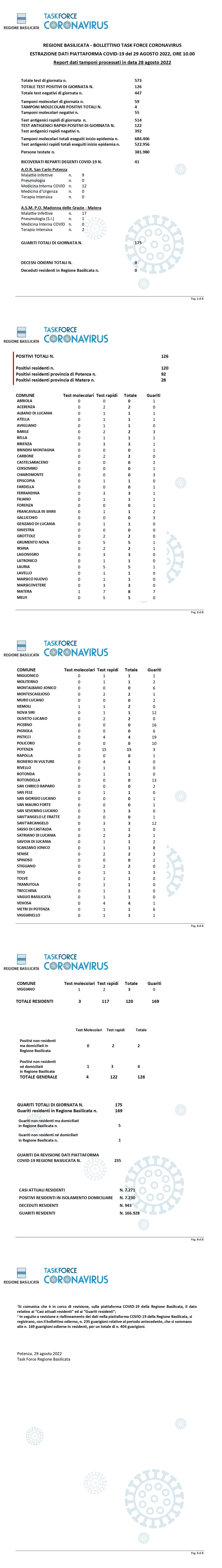 La task force regionale comunica che nella giornata di ieri 28 Agosto, sono stati processati 573 tamponi (molecolari ed antigenici) per la ricerca di contagio da Covid-19, di cui 126 sono risultati positivi.